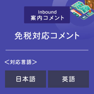 海外からお越しの旅行者のみなさまに安心してお買い物をお楽しみいただけるよう、免税でのお会計に対応している旨のコメントをお届けします。日本語、英語に対応していますので、外国人観光客の多いお店でのご案内としてご利用いただけます。