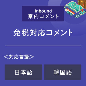 海外からお越しの旅行者のみなさまに安心してお買い物をお楽しみいただけるよう、免税でのお会計に対応している旨のコメントをお届けします。日本語、韓国語に対応していますので、外国人観光客の多いお店でのご案内としてご利用いただけます。