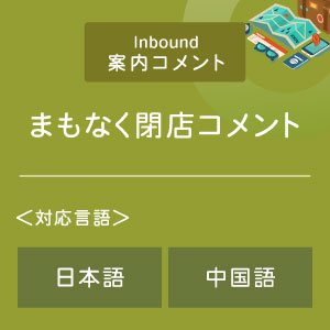 まもなくラストオーダーの時間となる旨を告げるコメントをお届けします。日本語、中国語に対応していますので、海外からお越しのお客様へのご案内としてご利用いただけます。