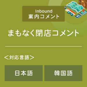 まもなくラストオーダーの時間となる旨を告げるコメントをお届けします。日本語、韓国語に対応していますので、海外からお越しのお客様へのご案内としてご利用いただけます。