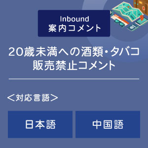 海外からお越しの旅行者のみなさまに、20歳未満の方への酒類およびタバコの販売は行っていない旨のコメントをお届けします。日本語、中国語に対応していますので、外国人観光客の多いお店でのご案内としてご利用いただけます。