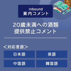 海外からお越しの旅行者のみなさまに、20歳未満の方への酒類の提供は行っていない旨のコメントをお届けします。日本語、英語、中国語、韓国語に対応していますので、外国人観光客の多いお店でのご案内としてご利用いただけます。