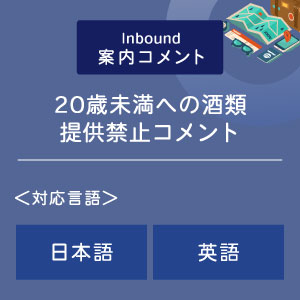 海外からお越しの旅行者のみなさまに、20歳未満の方への酒類の提供は行っていない旨のコメントをお届けします。日本語、英語に対応していますので、外国人観光客の多いお店でのご案内としてご利用いただけます。