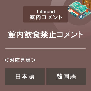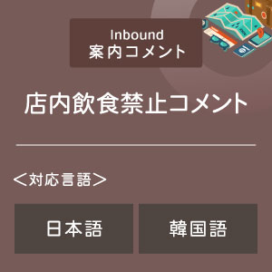 海外からお越しの旅行者のみなさまに、店内での飲食はご遠慮いただいている旨をご案内するコメントをお届けします。日本語、韓国語に対応していますので、外国人観光客の多いお店でのご案内としてご利用いただけます。