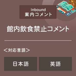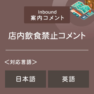 海外からお越しの旅行者のみなさまに、館内での飲食はご遠慮いただいている旨をご案内するコメントをお届けします。日本語、英語に対応していますので、外国人観光客の多い施設でのご案内としてご利用いただけます。