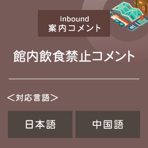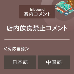 海外からお越しの旅行者のみなさまに、館内での飲食はご遠慮いただいている旨をご案内するコメントをお届けします。日本語、中国語に対応していますので、外国人観光客の多い施設でのご案内としてご利用いただけます。